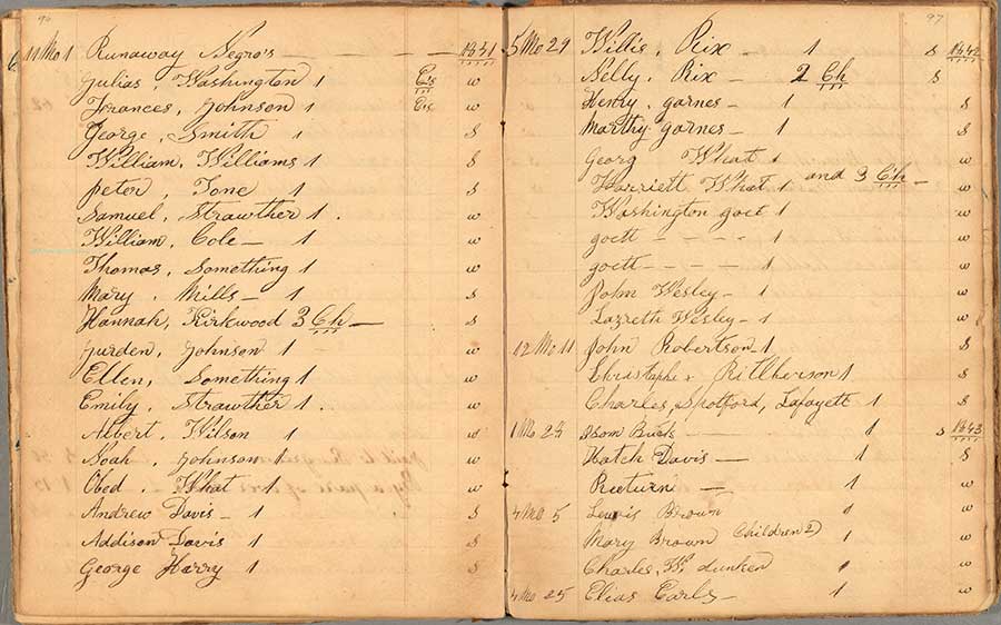 Pages 96 and 97 in Shugart’s account book (1851–53) listing enslaved people he helped usher to freedom. The Huntington Library, Art Museum, and Botanical Gardens.