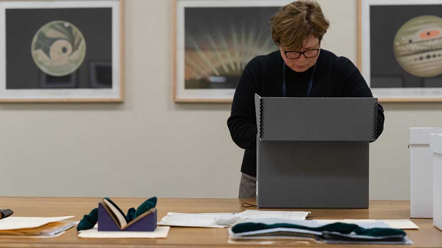 Olga Tsapina, the Norris Foundation Curator of American History at The Huntington, delves into the Shugart materials. Photograph by Aric Allen.
