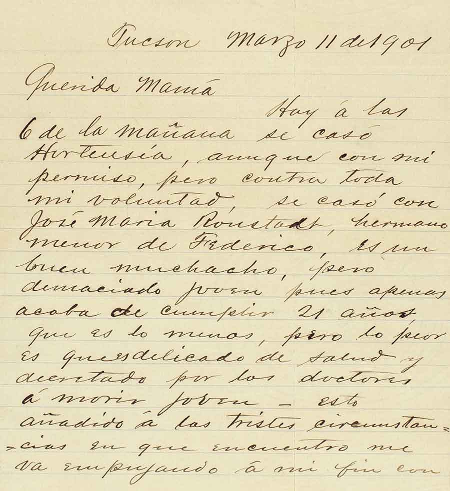 Letter, written in Spanish, from Winnall Augustín Dalton to his mother, María Guadalupe Zamarano de Dalton, March 11, 1901, regarding the marriage of his daughter, Hortense, to José Mariá Ronstadt—a man to whom the rock star Linda Rondstadt is related. Henry Dalton papers. The Huntington Library, Art Museum, and Botanical Gardens.