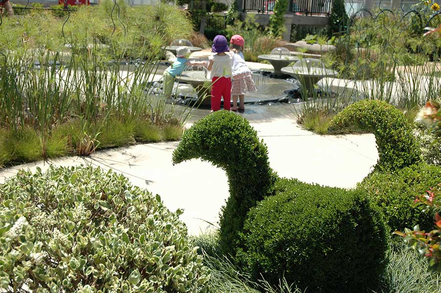 As topiary animals look on, children enjoy the shimmer and splash of toddler-sized fountains in the Helen and Peter Bing Children’s Garden. Photograph by Lisa Blackburn.