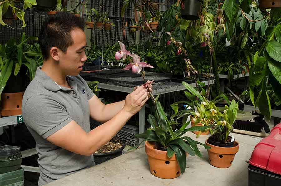 Orchid collection specialist Brandon Tam pollinates a Paphiopedilum delrosi in a Huntington greenhouse. The Huntington Library, Art Museum, and Botanical Gardens.