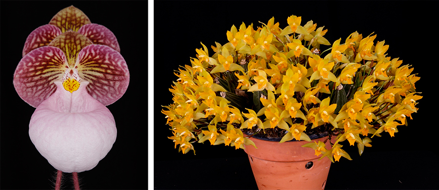 Two of The Huntington’s award-winning orchids. Left: This Paphiopedilum micranthum ‘Huntington’s Perfection’ FCC/AOS received the Merritt W. Huntington Award for “Most Outstanding Orchid” in 2015. Right: Lycaste consobrina ‘Huntington’s Finest’ AM/AOS CCE/AOS received the Butterworth Award, which goes to the grower of the plant exhibiting the finest orchid culture, and also received the Benjamin C. Berliner award, which is given to the most outstanding example of the genus Lycaste or its closely allied genera. At the time of judging, it had a total of 287 flowers and seven buds. Photographs by Arthur Pinkers.