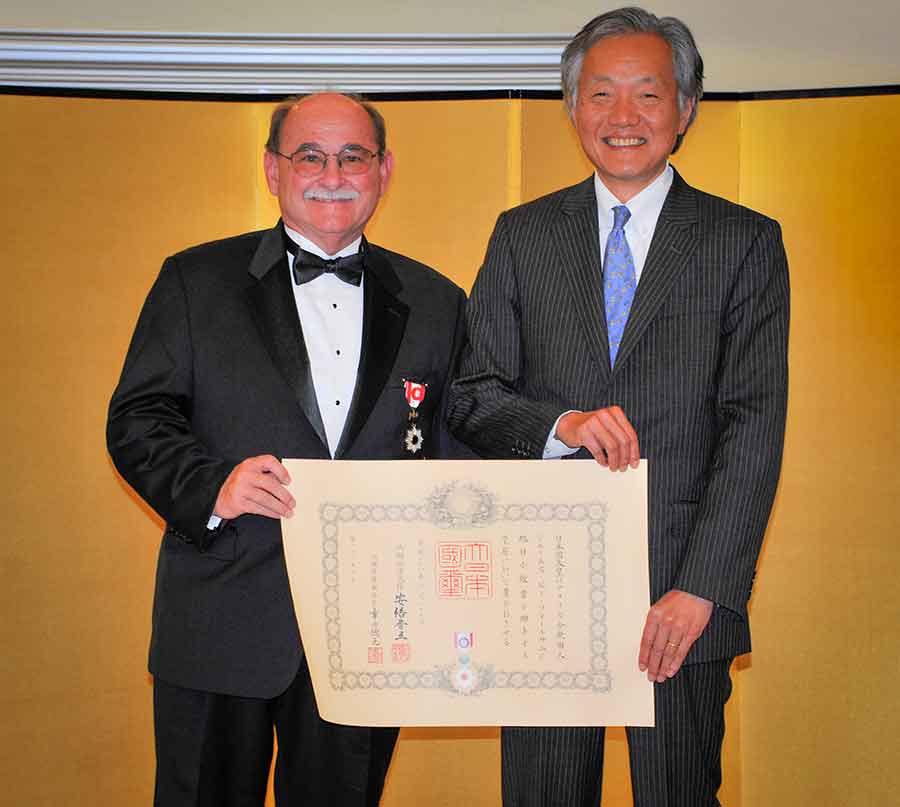 James Folsom poses with Consul General Harry H. Horinouchi on June16, 2016, after being awarded the imperial Order of the Rising Sun, Gold Rays with Rosette, for his work promoting Japanese culture in the United States. Photograph by Andrew Mitchell.