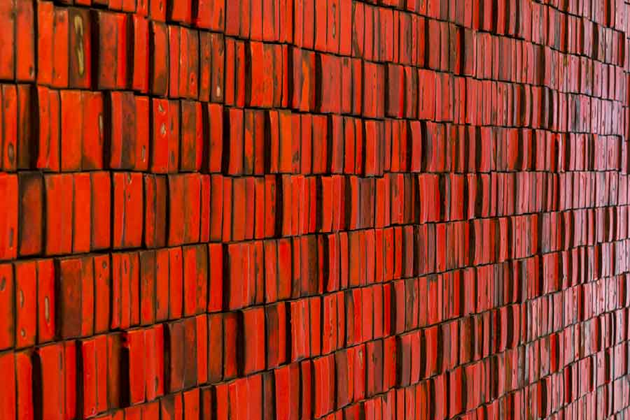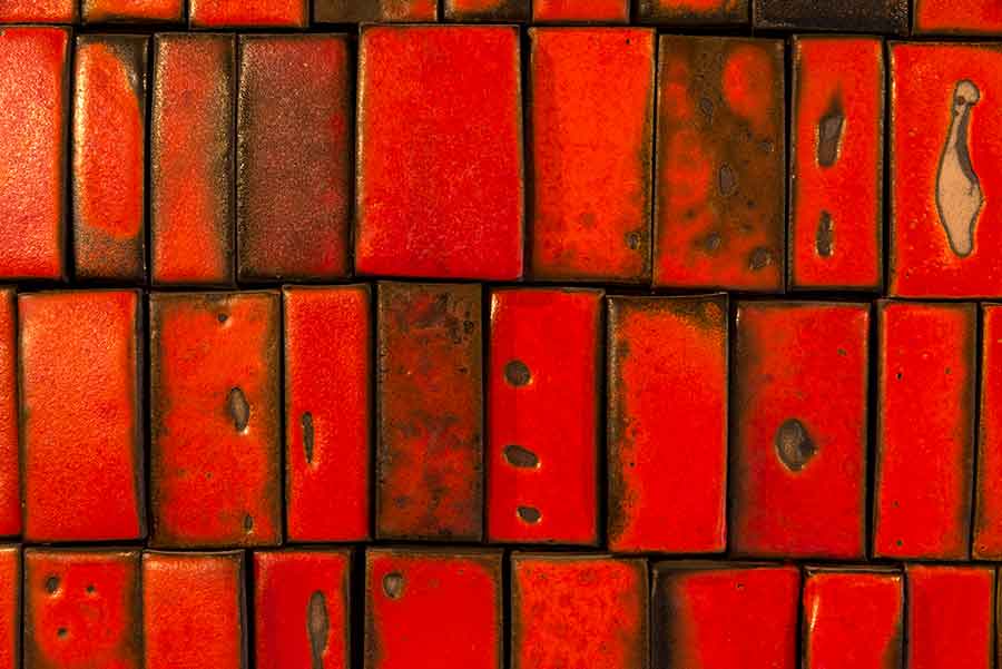Active as a ceramic artist in Los Angeles, Doyle Lane started out making traditional functional objects—such as cups, bowls, pots, and vases—thrown on a wheel and fired in a kiln. However, like other ceramists in Southern California—such as Peter Voulkos, who took a cue from abstract sculpture and created shattered and fractured forms—Lane resisted the association of ceramics with functionality by transforming his work into what he called "clay paintings." Lane employed various colored glazes and glaze techniques to achieve textures that ranged from blistered to icy smooth. The Huntington's Lane mural was commissioned by the 1960s architectural firm Welton Becket and Associates for the Pasadena branch of Mutual Savings and Loan. Lane took the mural's size (17 feet long and more than 8 feet high) and public location as an opportunity to make a statement. First, grids and patterns found in Lane's mural were widely incorporated into paintings during the 1960s by artists as diverse as Frederick Hammersley and Robert Rauschenberg. Second, while from a distance the mural has a pleasing regularity and seems to be a bright red-orange, on closer inspection, you notice that Lane injected an element of irregularity. A master of notoriously finicky red glazes, he worked with rather than against their unpredictable nature—the tiles' color shifts from red to orange with areas of green and black in between. Moreover, patches of unglazed brown clay peek through in some places, and bubbles from gases formed during firing vary the tiles' surfaces. Finally, the tiles are placed at various levels, making them not like bathroom and kitchen tiles that flatly cling to a wall but like loosely stacked blocks. Lane turned each small tile into an abstract painting that seems to radiate light and then stacked them into a wobbly, almost-animated wall. The mural reveals an artist pushing the ceramic medium to new levels of complexity and using an architectural commission to realize his own vision.