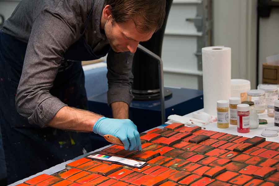 Sculptor and freelance conservator Morgan MacLean spent four months at The Huntington—documenting, treating, and installing the Lane mural in the new Steven S. Koblik Education and Visitor Center. In this photograph, MacLean uses an artist knife to apply a thin coat of a treatment comprising acetone, Paraloid B-72 (a clear acrylic resin), marble powder, and dry pigment to a damaged section of a tile. Out of the 4,876 tiles that make up the mural, MacLean restored 256 tiles that showed some evidence of damage.