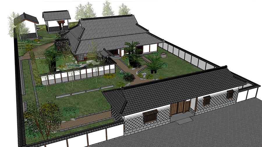 Artist’s rendering of the reconstruction, with the original shoya residence in the center, two kura storehouses at the rear, and recreations of the gatehouse and interior garden. The anticipated public opening date is Fall 2022.