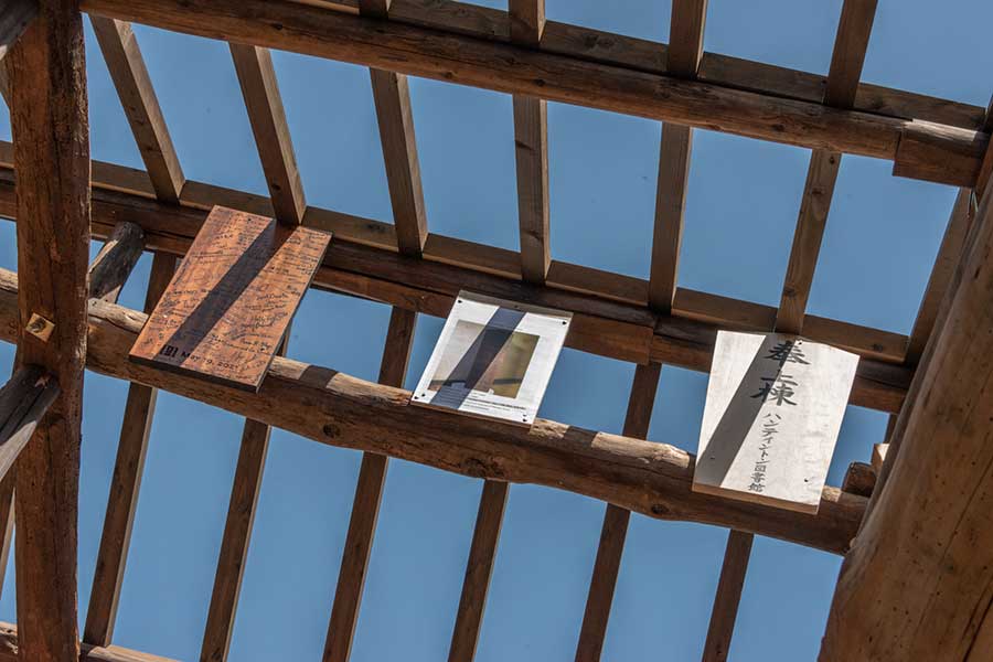 Yokoi then invited those in attendance to write their names on a wooden plaque that would be affixed to the rafters of the house—a time-honored tradition in Japan that has been passed down through the centuries. The plaque was subsequently installed at the highest point in the roof; next to it was hung a photo of an age-worn plaque dating from the house’s construction in 1695, inscribed with the original builders’ names.