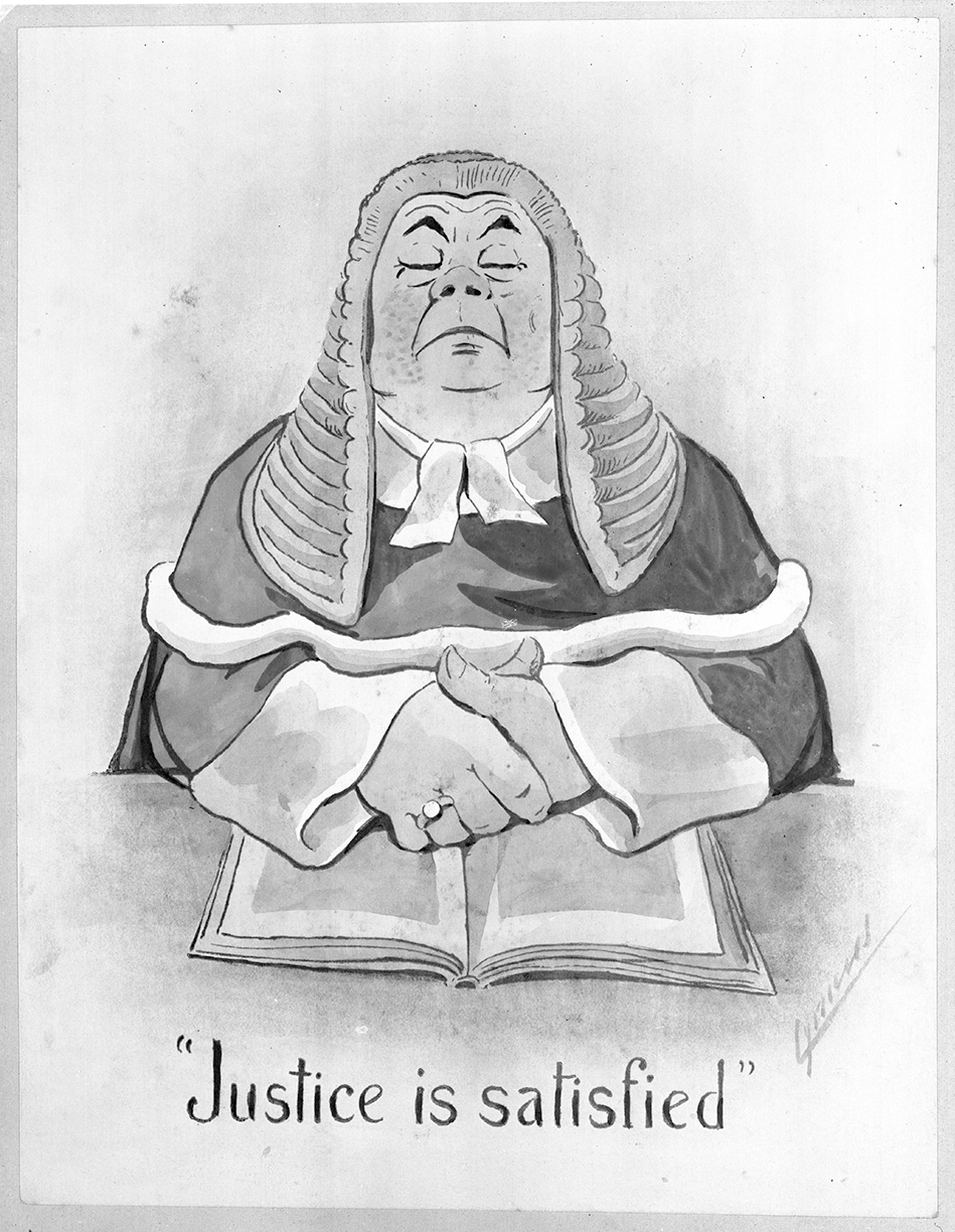 Martin Anderson (1854–1932), Justice is satisfied, watercolor [rendered here in a black-and-white photograph], 8 5/8 x 6 3/4 in. (21.9 x 17.1 cm). The Huntington Library, Art Museum, and Botanical Gardens.