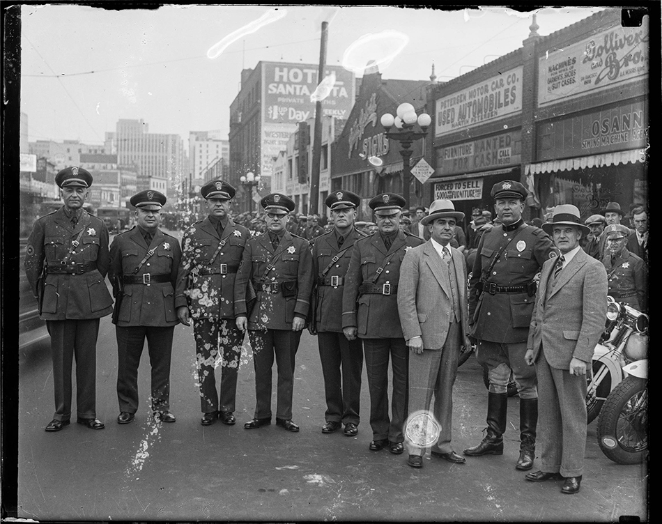 George W. Haley (1879–1963), Law enforcement officers on South Main Street, Los Angeles, ca. 1929, glass negative, plate 10.2 x 12.7 cm. Ernest Marquez Collection. The Huntington Library, Art Museum, and Botanical Gardens. Uniformed California Highway Patrol officers standing with CHP superintendent Eugene W. Biscailuz (1883–1969), in a suit, third from right.