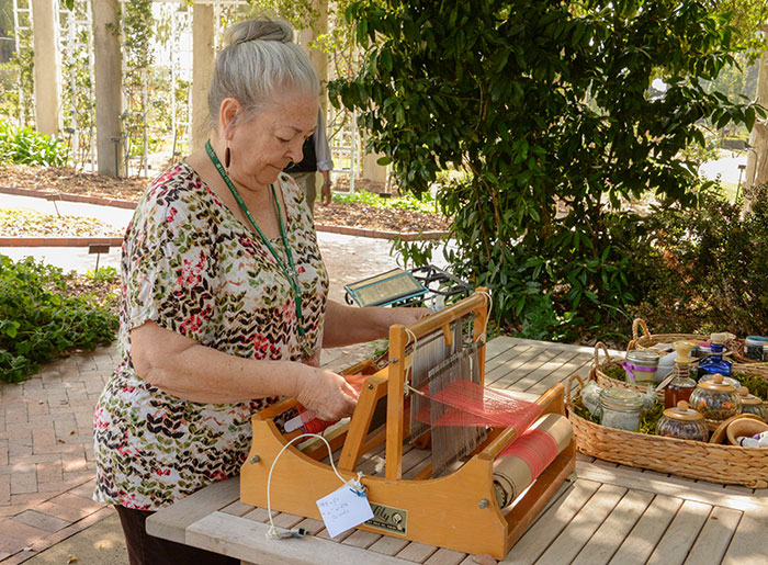 Lorynne Young, Herb Garden docent chair, weaves on a table loom in the Herb Garden. Photo by Deborah Miller.