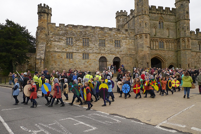 Schoolchildren in medieval dress parade in front of the gatehouse of the Battle Abbey. Photo by Paul Hollinghurst.