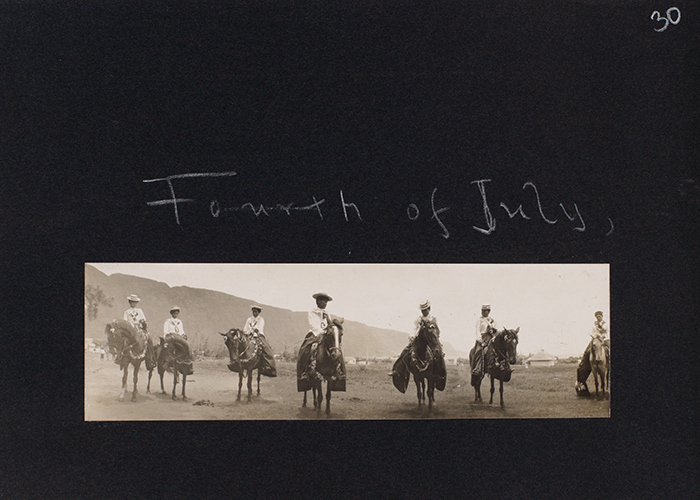 Women Pa’u riders on horseback and wearing traditional costumes, Kalaupapa, Molokai, July 4, 1907. Jack London Collection. The Huntington Library, Art Collections, and Botanical Gardens.I had only an iPhone in my pocket as I waited for the bus that would take me on a historical tour of the area. A few National Park Service vehicles drove past. (Kalaupapa became a National Historical Park in 1980.) From what I could see, the place was as eerily quaint and idyllic as it had appeared a century earlier when Jack and Charmian rode in on horseback.