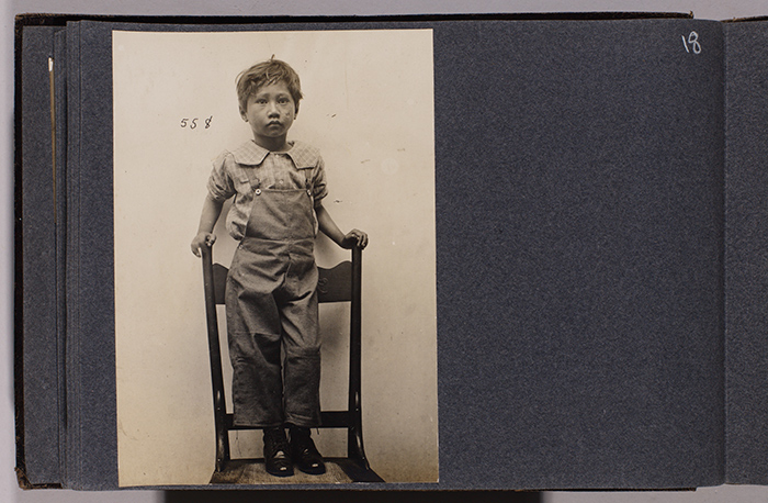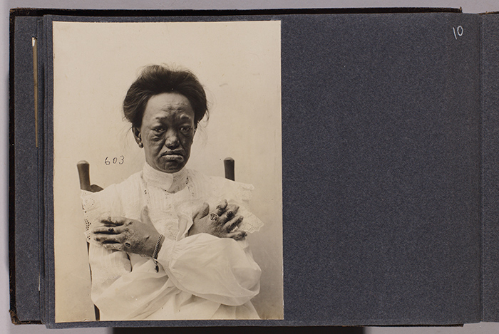 Miss Kanoelani Hart (case 603), age 22, from Waimea, Hawaii, July 3, 1906. Jack London Collection. The Huntington Library, Art Collections, and Botanical Gardens.Several of the pictures pasted into three albums stamped “Molokai” in The Huntington’s Jack London archive belie the writer’s upbeat article. There are many photos of Fourth of July revelers, as well as shots of the remarkable setting and people posed in front of well-kept buildings with tidy lawns. But none of the afflicted came to the settlement by choice, and some of the government-issue portraits included in the archive tell a darker tale. In these, the sitters’ expressions are frozen in a paralyzed grimace, and their eyes look inconsolably sad.