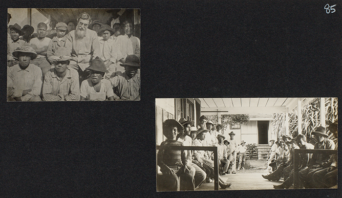 Two images of Joseph Dutton on Molokai, ca. 1905. In the image on the left, Dutton sits with a group of Hawaiian men and boys. In the image on the right, Dutton is seen with a group of men on a porch of what may be the Baldwin Home for men and boys that Dutton founded on Molokai.You can view the Jack London Photographs and Negatives collection online at the Huntington Digital Library.