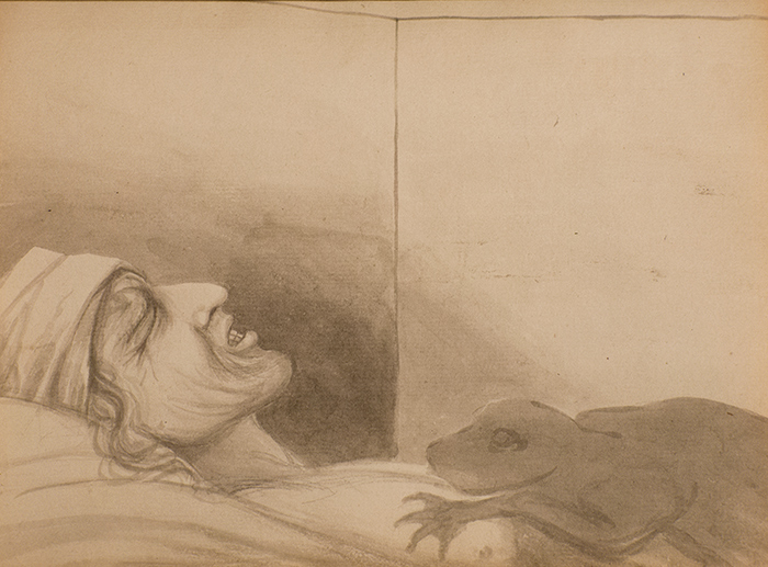 A monstrous frog-like creature nibbling at the breast of a corpse; a claustrophobic encounter between two women who embrace under the eyes of a shadowy watcher; a raving sorceress surging forward, bent on destruction—believe it or not, these disturbing images come from the mind of George Romney, the British painter best known at The Huntington for his dazzling portraits of glamorous ladies and gentlemen that hang throughout the Huntington Art Gallery. Along with Thomas Gainsborough and Sir Joshua Reynolds, Romney vied for the title of Britain’s most fashionable portrait painter in the 1770s and 80s. As they built their own great collection of British art, Henry and Arabella Huntington bought a dozen of Romney’s portraits—from life-size images of stylish brides like Penelope Lee Acton to intimate peeks at the alluring charms of the notorious Emma, Lady Hamilton. Romney’s paintings helped codify what it meant to be beautiful, rich, and aristocratic in late 18th-century Britain.