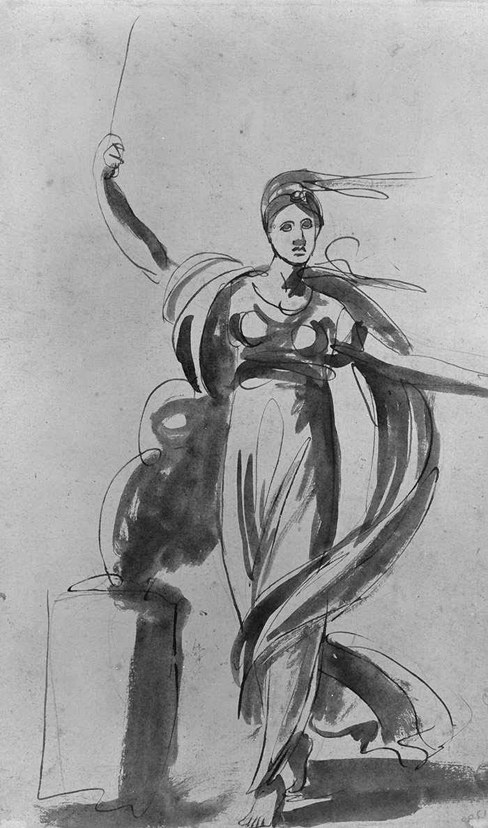 George Romney, Study of a Striding Female Figure, perhaps Emma Hart as Circe, early 1780s, pen and ink and brown and blue wash over graphite [rendered here in black and white]. Huntington Library, Art Collections, and Botanical Gardens. On view in "Eccentric Visions."
