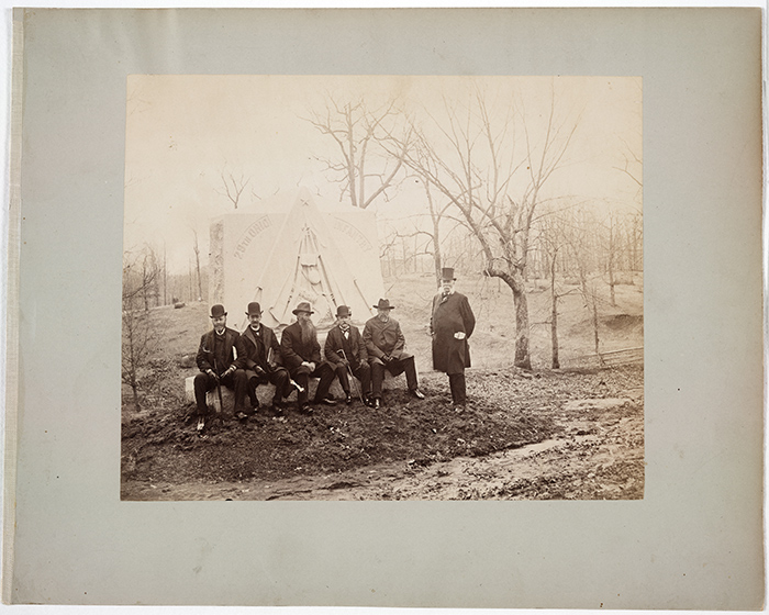 Veterans with John B. Bachelder [standing] at the 29th Ohio Infantry Monument, Gettysburg, ca. 1887. Unidentified photographer. The Huntington Library, Art Collections, and Botanical Gardens.