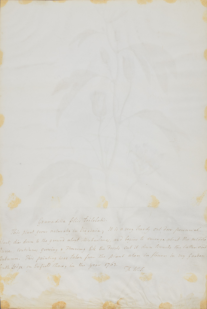 William King (British, active mid to late 18th century), Granadilla Foliis Trilobatis (verso, showing annotations by Thomas Skinner), 1763. The Huntington Library, Art Collections, and Botanical Gardens.