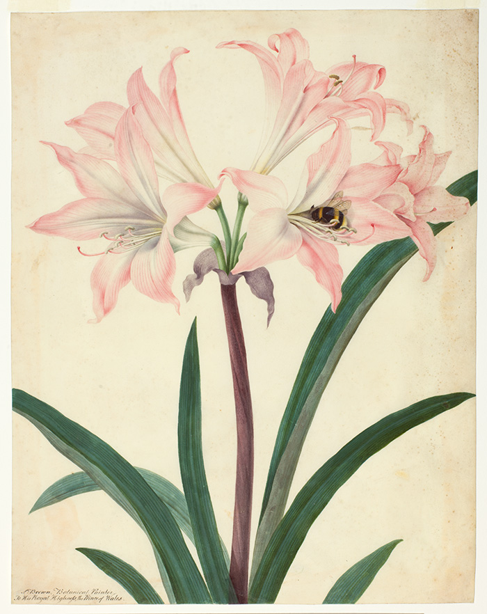 Artist Peter Brown (active 1766–1791) had been tutoring a number of aristocrats who engaged in botanical illustration before being appointed botanical painter to the Prince of Wales. His striking image of Belladonna Amaryllis is similar to one that once formed part of an album of botanical illustrations made by Elizabeth Montagu (1741–1832), Duchess of Manchester. The presence of a number of Brown’s drawings inside the Duchess’s albums suggests that he may even have been her tutor.