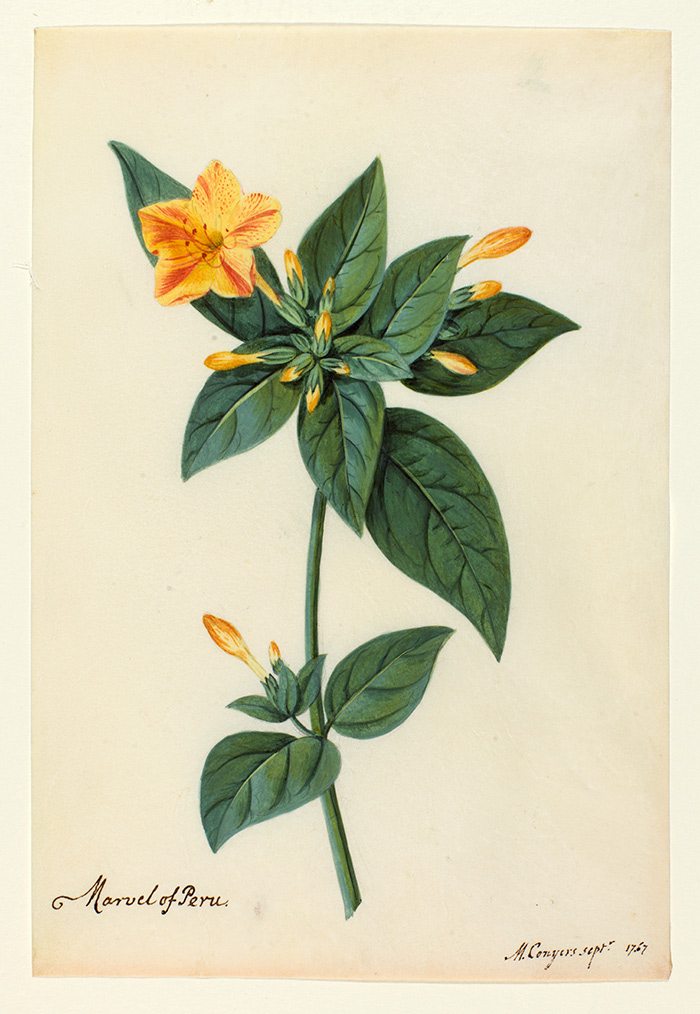 Matilda Conyers (British, 1698–1793), Marvel of Peru, 1767, watercolor and gouache on vellum. The Huntington Library, Art Collections, and Botanical Gardens.