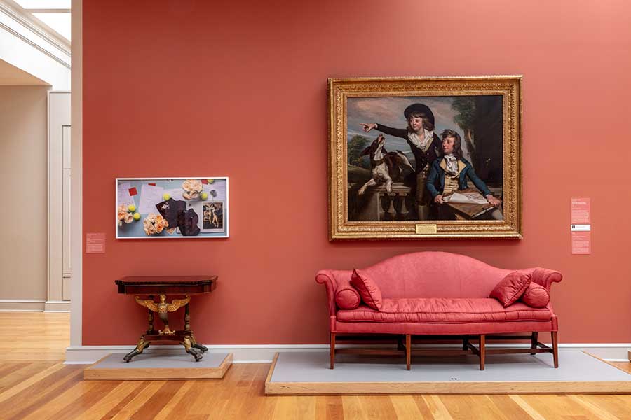Buck Allison’s photograph Untitled (Cufflinks), left, appears alongside John Singleton Copley’s The Western Brothers in The Huntington’s Virginia Steele Scott Galleries of American Art. Buck Ellison, Untitled (Cufflinks), 2020, archival pigment print, 21 7/8 × 41 in. (55.6 × 104.1 cm). Courtesy of the artist, Balice Hertling, Paris, and Sunday Painter, London. Photo by Joshua White.