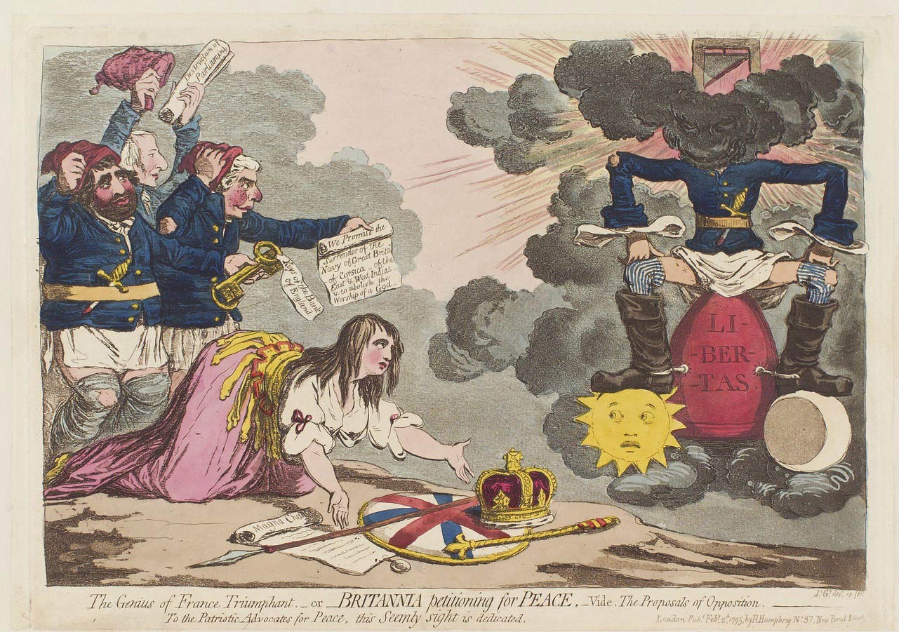 The 1795 James Gillray cartoon titled “Genius of France” shows Britannia laying Magna Charta (again with a “Ch,” and again with no article “the”) at the feet of the French Revolution. (Click the image above to see a larger version of it; the "Magna Charta" is the document lying on the ground under the spear.) Visual sources like this help scholars plot the evolution of language over time. The Huntington Library, Art Collections, and Botanical Gardens.