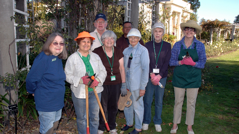 Rose Garden volunteers pause for a quick group portrait before getting back to business. From left: Kathy Cooper, Nora Romo, James Drummond, Marlane Forsberg, Vicente Perez (staff), Gena Coffey, Patti Yates, and Margo Drummond.