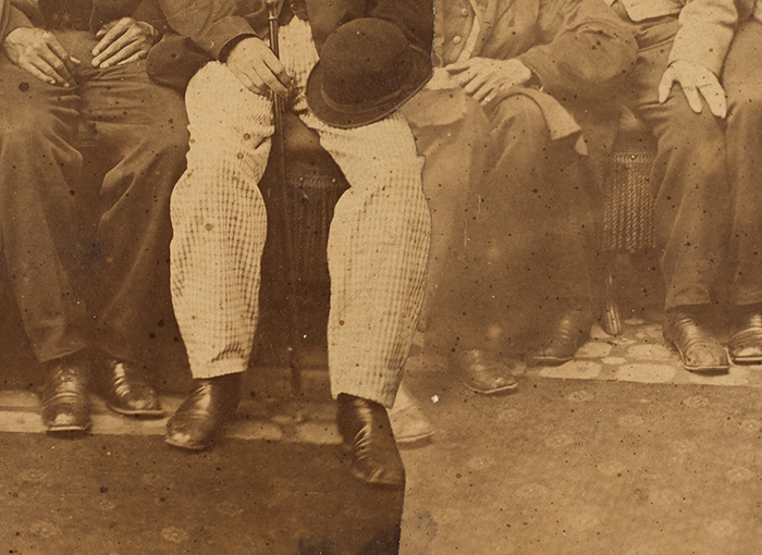 The photograph revealed few facts. A composite of two images crudely pasted together (the obvious overlap between the man in checked pants at center and the sitter next to him provides a clue), it had no date or other identifying information. On the picture’s back, a studio stamp: the Lee Photographic Gallery.