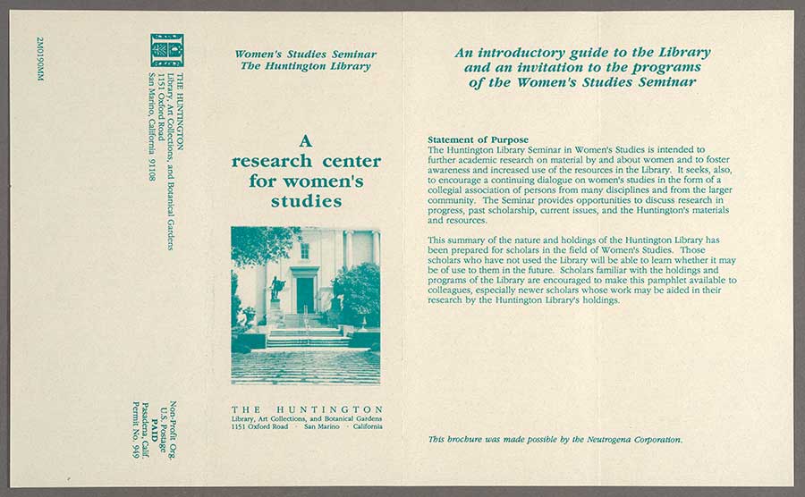 Brochure advertising The Huntington Library’s Women’s Studies seminars in the 1980s. The Huntington Library, Art Museum, and Botanical Gardens.