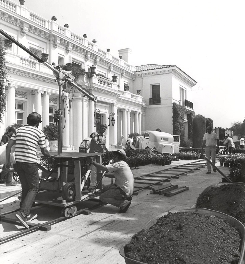 The south terrace makes for a wonderfully varied film location. Parties and weddings are popular ("The Country Bears," "Master of Disguise," "Miss Match"); possibly the most spectacular set was for "Town and Country," which featured an entire Ferris wheel set up on the Rose Garden lawn, along with other midway attractions. "Captain America" draped the building in red, white, and blue bunting to stage a 1940s awards ceremony. Perhaps the most unusual usage was for Peter Bogdanovich's "At Long Last Love," in 1974 (right). In a perfect example of "things we probably wouldn't do today," an antique roadster was placed on the terrace to give the appearance of a "morning after" a riotously cheery night out. The south door was their front door, and Cybill Shepherd and Burt Reynolds wandered in and out of the building and down into the Rose Garden.