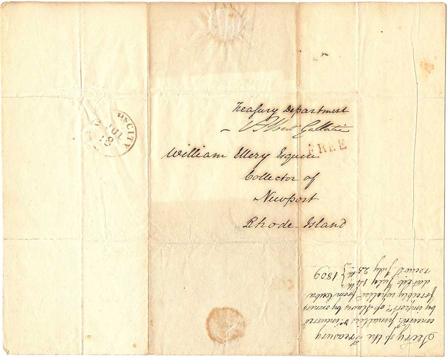 Letter addressed by Secretary of the Treasury Albert Gallatin (1761–1849) to William Ellery (1727–1820), the collector of customs in Newport, Rhode Island, on July 14, 1809. The Huntington Library, Art Museum, and Botanical Gardens.