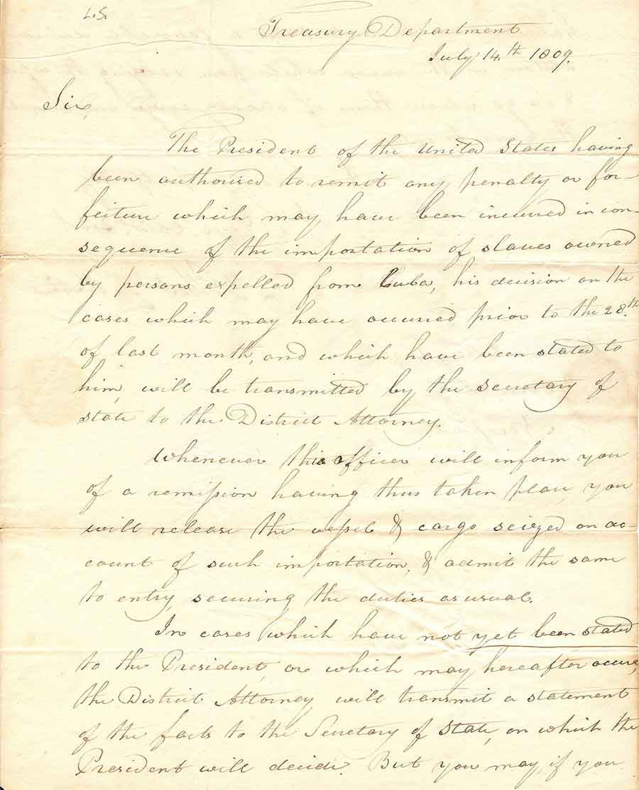 First page of a letter by Secretary of the Treasury Albert Gallatin to William Ellery, the collector of customs in Newport, Rhode Island, dated July 14, 1809. Gallatin, acting on the orders of the President James Madison, not only orders Ellery to “release the vessel & cargo” belonging to the “persons expelled from Cuba,” but pointedly instructs him “to anticipate a favorable decision” in all future similar cases and thus “abstain” from any contravening actions. The Huntington Library, Art Museum, and Botanical Gardens.