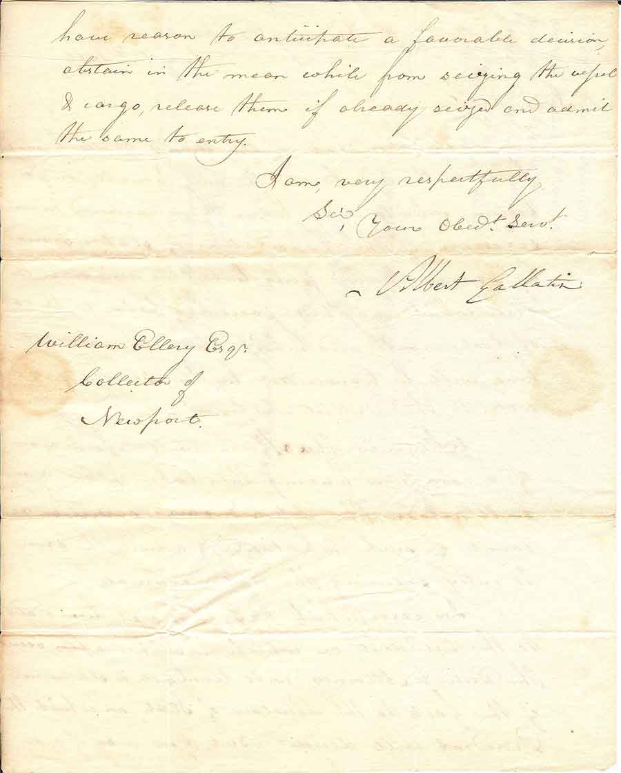 Second page of a letter by Secretary of the Treasury Albert Gallatin to William Ellery, the collector of customs in Newport, Rhode Island, July 14, 1809, showing Gallatin’s signature. The Huntington Library, Art Museum, and Botanical Gardens.