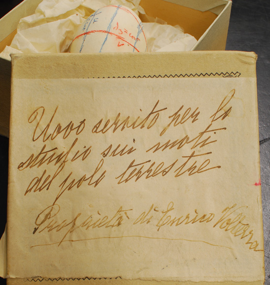 When we met at The Huntington to look at the egg together, Goodstein first told me that the handwriting on top of the box is that of Vito's wife, Virginia, who had a penchant for collecting objects in the family history. Goodstein guessed that Vito Volterra used this egg to teach his son, Enrico, later a mathematician himself, about the motion of the terrestrial poles.