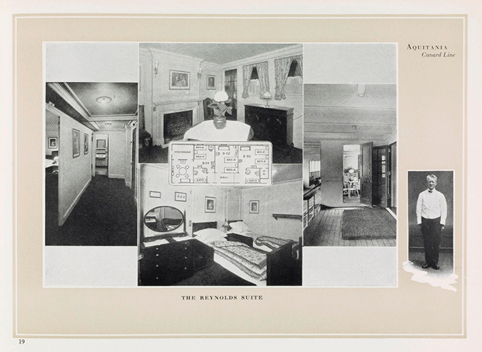 Photographs and a plan of the Reynolds Suite, a mirror image of the Gainsborough Suite, from the RMS Aquitania brochure, ca. 1925. The Huntington Library, Art Collections, and Botanical Gardens.