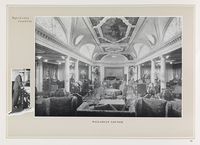 A view of the Palladian Lounge, an elegant room recalling the designs of 16th-century Venetian architect Andrea Palladio, from the RMS Aquitania brochure, ca. 1925. The Huntington Library, Art Collections, and Botanical Gardens.