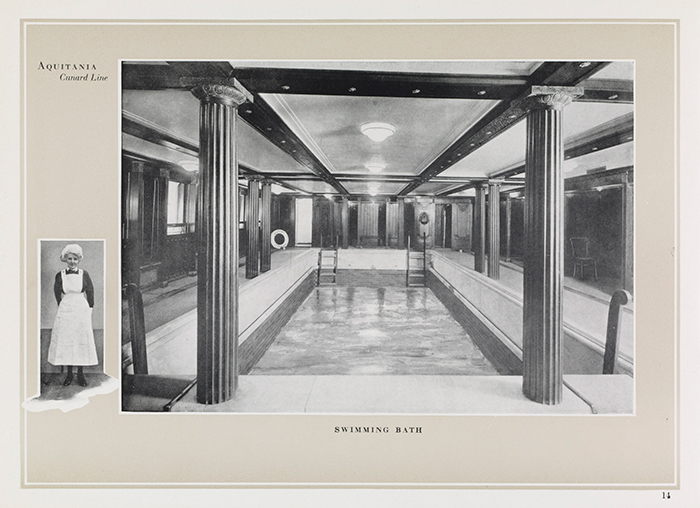 For entertainment, first-class passengers had at their disposal a pool, a gymnasium, and a series of lounges, from the RMS Aquitania brochure, ca. 1925. The Huntington Library, Art Collections, and Botanical Gardens.