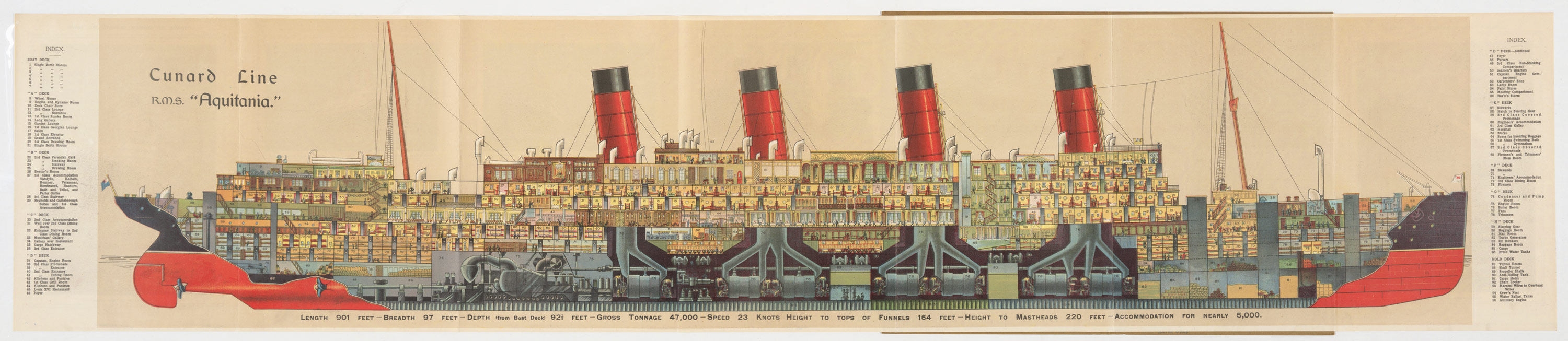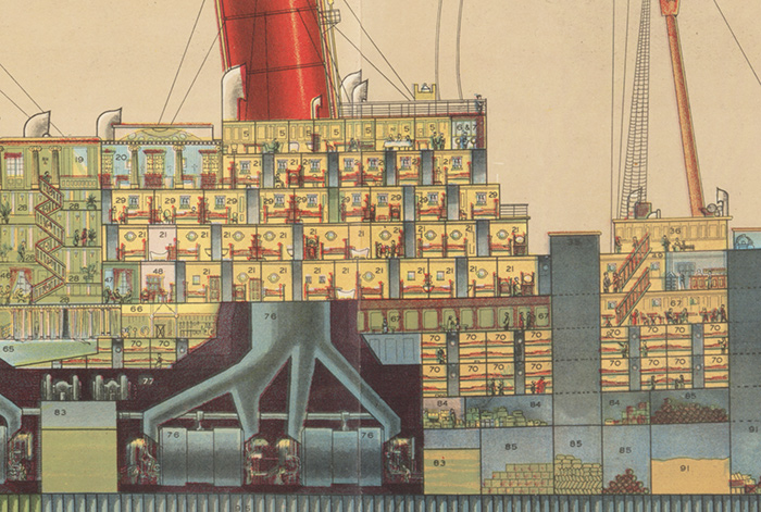Detail of a cutaway depiction of the RMS Aquitania, starboard side, foldout brochure, ca. 1921. The index accompanying the cross-section indicates that rooms labeled with the number 29 are the “Reynolds and Gainsborough Suites and 1st Class Accommodation.” Full image available here. The Huntington Library, Art Collections, and Botanical Gardens.