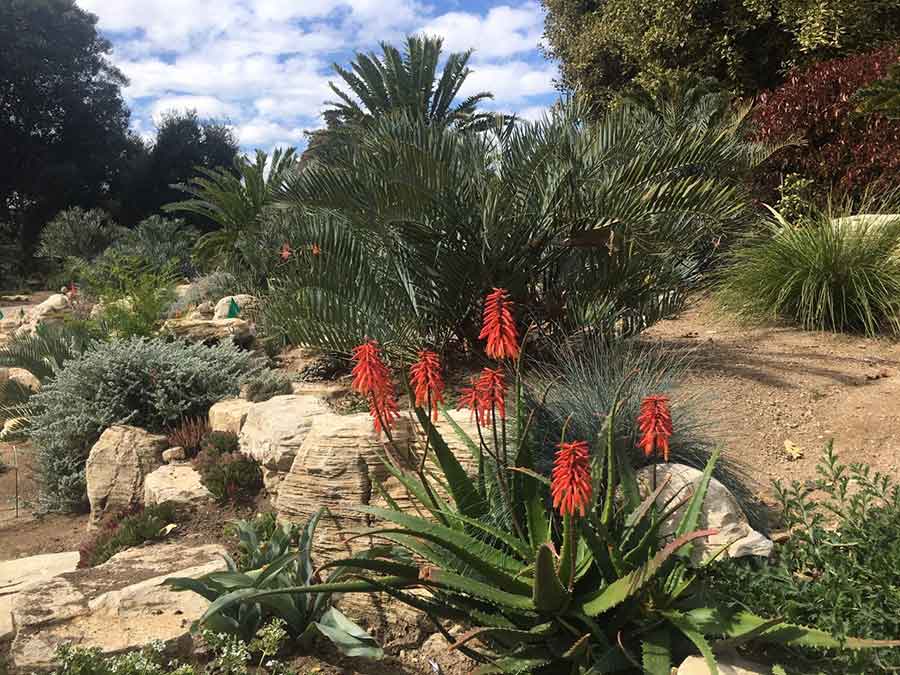 The Huntington’s new cycad garden showcases thousands of unusual plants from the renowned plant collection of Loran Whitelock, including this Aloe cameronii (red aloe) blooming in front of a large cycad, Encephalartos trispinosis. Photo by Usha Lee McFarling.