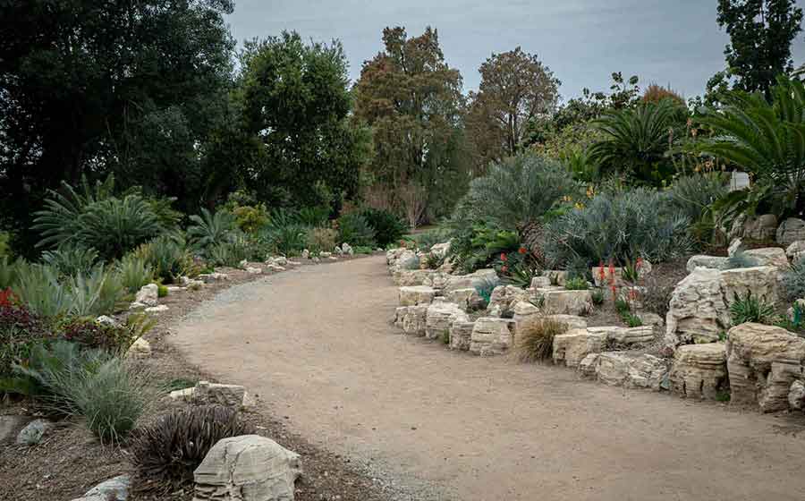 The walk is on a hill to the south of the Huntington Art Gallery terrace. A paved, winding path makes the area suitable for all visitors, including those who use wheelchairs or walkers, and benches are plentiful.