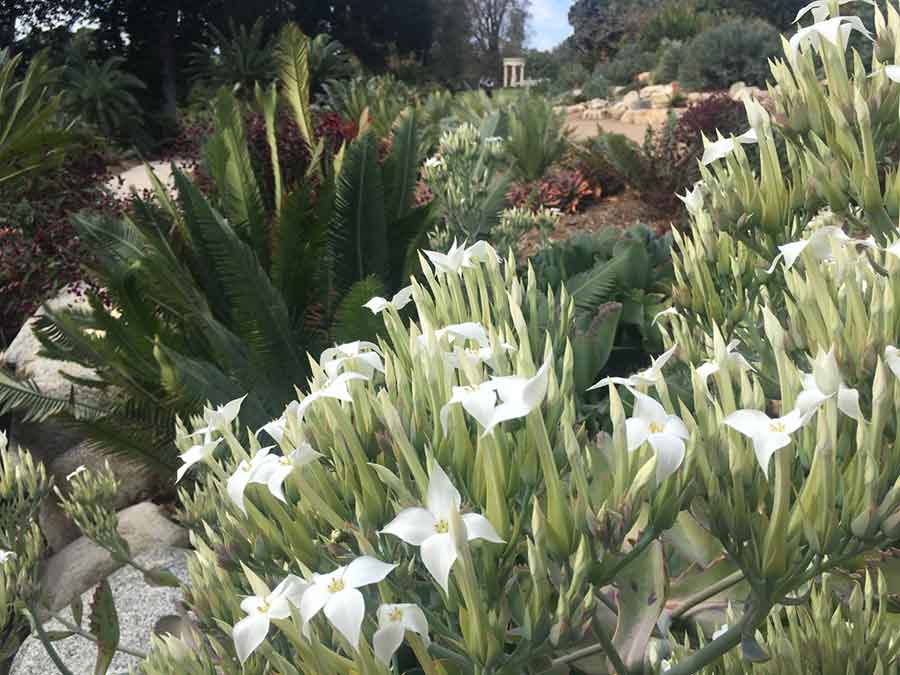 Once the hardscaping and cycads were in place, the final touch was to add in hundreds of companion plants that Whitelock had also collected and displayed. These can be found throughout the garden—from gigantic staghorn ferns, growing on tree trunks above the walk, to dainty euphorbias, begonias, succulents, and bulbs that add colorful flowers throughout the year.