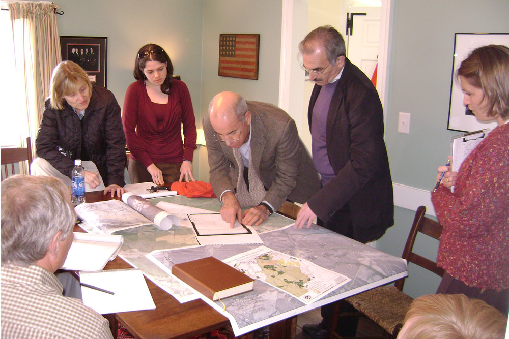 Fraser Neiman (center), the director of archeology at Monticello, points to a copy of the map from the Huntington collection as the survey team compares it to the current maps (photo by Laura Voisin George).