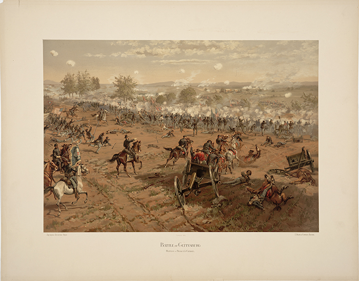 Battle of Gettysburg, repulse of Pickett’s charge by Thure de Thulstrupo (1849–1930), L. Prang & Co., Boston (Mass.), 1887. Color printed lithograph, overall 21 7/8 x 28 in. (55.56 x 71.12 cm). Jay T. Last Collection of Graphic Arts and Social History. The Huntington Library, Art Collections, and Botanical Gardens.