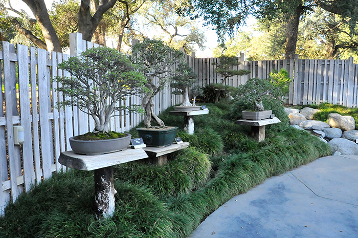 Two recent gifts, a Chinese elm (left) and a coast live oak (right, foreground), are exquisite specimens representing the highest ideals in bonsai artistry. They’ll be on view this weekend in the Frances N. Brody Botanical Center for the Bonsai-a-Thon event, and then will move back to the Zillgitt Bonsai Court of the Japanese Garden. Photo by Andrew Mitchell.