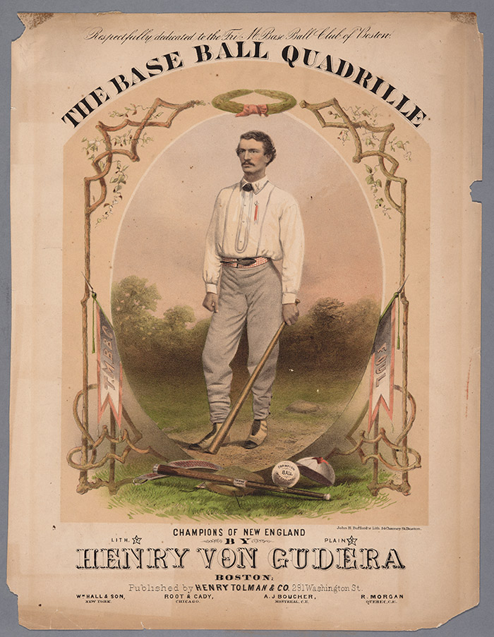 The Base Ball Quadrille. Sheet music, 1867. Printed by John H. Bufford’s Lith., Boston, Mass., color lithograph on paper, 13¾” x 10½”. Composer Henry Von Gudera “respectfully dedicated” this musical composition to the Tri-Mountain Base Ball Club of Boston. Curiously, the Tri-Mountains would become the first of the organized clubs playing the Massachusetts Game to abandon it in favor of the New York Game. Bases, similar to today, appear in the foreground and background of the image, indicating the New York-style rules. By contrast, the Massachusetts Game used stakes to mark bases. Gift of Jay T. Last. The Huntington Library, Art Collections, and Botanical Gardens.
