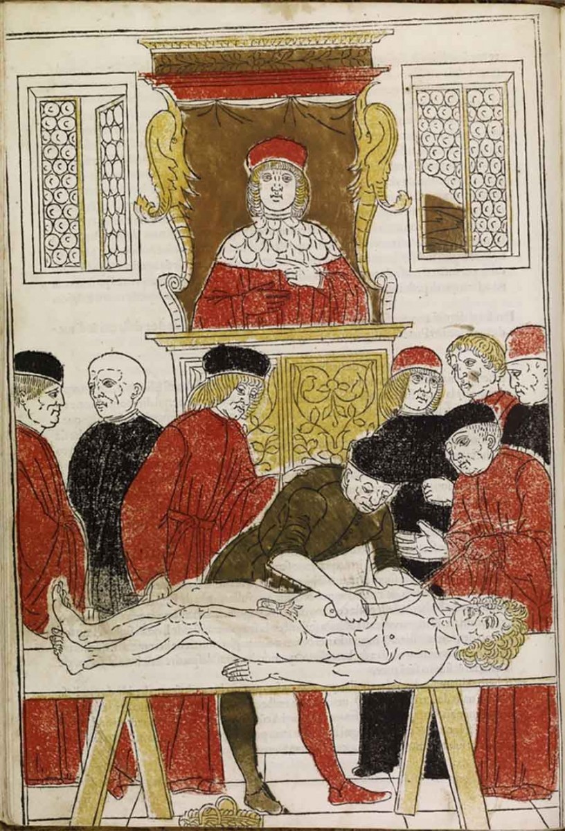The Huntington Library holds several incunabular editions of the Fasciculus Medicinae (Little Bundle of Medicine) including the first edition printed in Venice in 1491. The collection of texts included part of Mondino de Liuzzi’s Anatomia and this 1494 edition copies an earlier illustration of a university dissection scene but employed block color printing. The mismatched colors of the Sector’s legs remain mysterious. Ketham, Fasiculo de medicina, and Mundinus, Anatomia, Venice, 1493/1494. The Huntington Library, Art Museum, and Botanical Gardens.