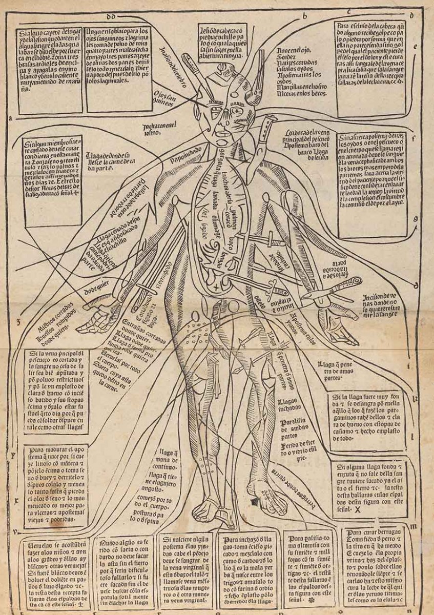 The so-called “wound man” first appeared as early as the 14th century in manuscript form and was first printed in the Fasciculus Medicinae. The illustration shown here is from a remarkably rare vernacular Spanish translation of the Fasciculus from The Huntington’s collections that apparently only survives in six libraries throughout the world. Joannes de Ketham (active 15th century), Epilogo en medicina y cirurgia, Burgos, 1495. The Huntington Library, Art Museum, and Botanical Gardens.